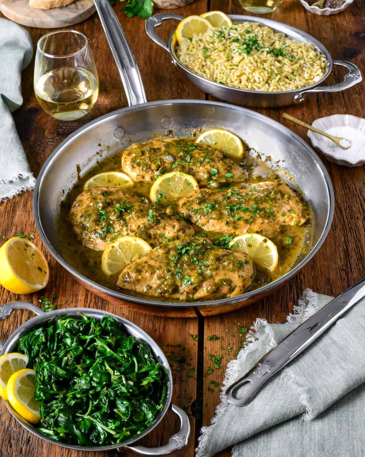 Serve the chicken alongside a bed of orzo and spinach. Pour the extra sauce over the chicken so it trickles down into the orzo for a cohesive, restaurant-style presentation. Serve with crusty bread for soaking up any extra sauce.