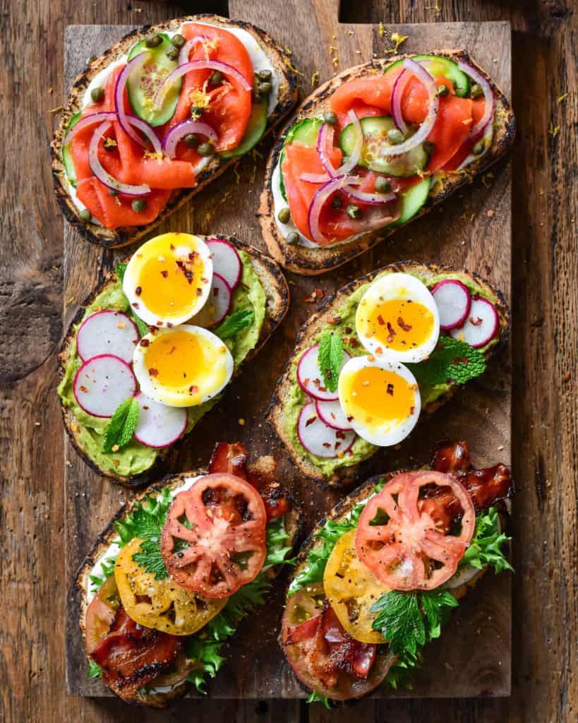 - Smoked Wild Sockeye Salmon: Spread 1½ tablespoons of the yogurt-hummus spread on each piece of toast, then add the salmon, cucumber, red onions, capers, and finish with some lemon zest. (Some fresh dill would be nice on this as well)