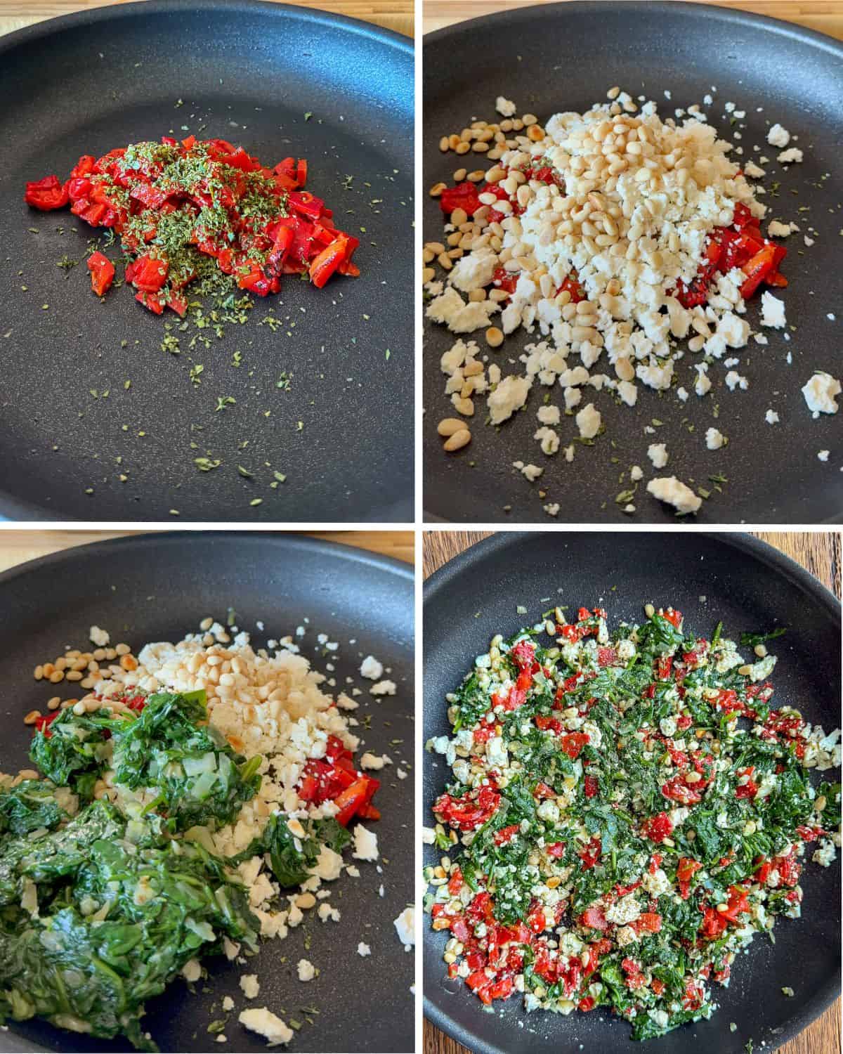 - In a skillet, heat a bit of olive oil over medium. Sauté shallot and garlic until translucent.Add spinach and cook until wilted. Drain or blot to remove excess moisture.In a mixing bowl, combine spinach, roasted peppers, crumbled feta, toasted pine nuts, thyme (and optional sage). Season lightly with salt and pepper.